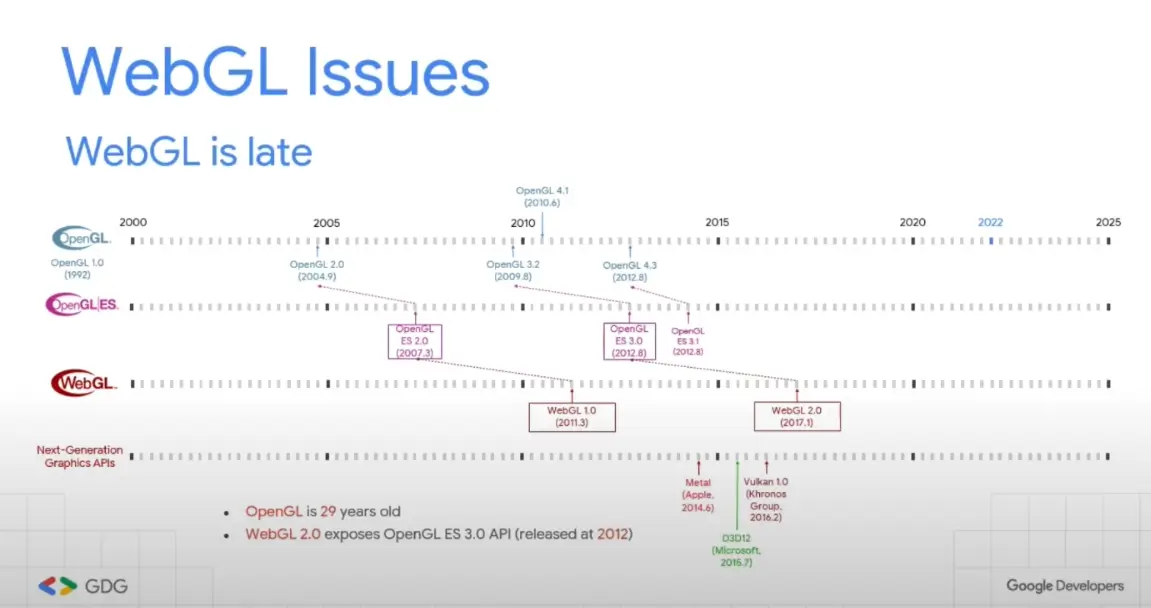 Because WebGL is developed based on OpenGL ES, and OpenGL ES is also based on OpenGL, which makes both the derivatives hard to catch the version updates. It leads to a situation where the GPU is updated with more powerful functions but the API does not make use of those features.